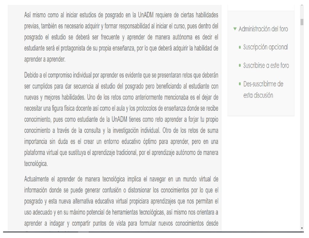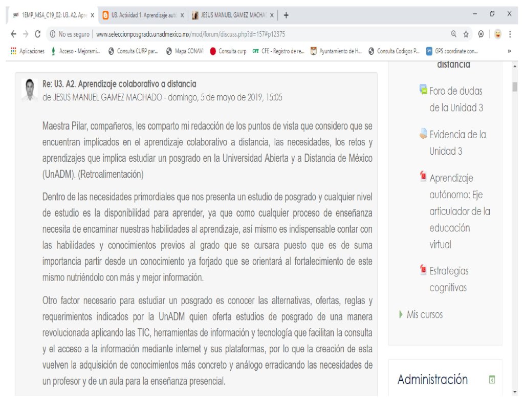 Redacción de los puntos de vista que considero que se encuentran implicados en el aprendizaje colaborativo a distancia, las necesidades, los retos y aprendizajes que implica estudiar un posgrado en la Universidad Abierta y a Distancia de México (UnADM).
